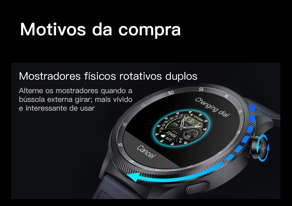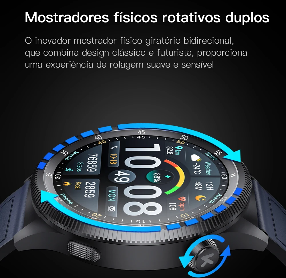 ? Dupla Coroa Giratória – Controle mais intuitivo e divertido, com menus que giram junto com a coroa.