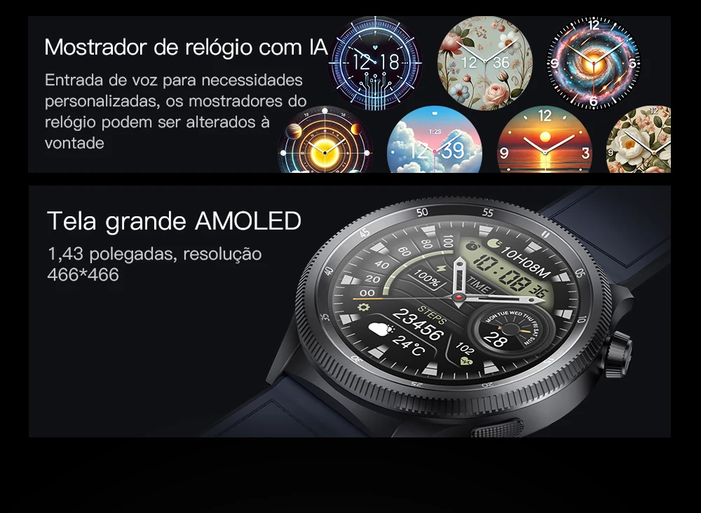 ?? Tela AMOLED de 1.43” com resolução 466×466 – Imagem nítida, colorida e com brilho ideal para uso ao ar livre.