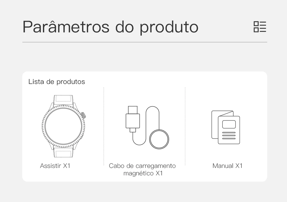 Relógio inteligente * 1 (incluindo alça padrão), cabo de carregamento magnético sem fio * 1, instruções * 1.