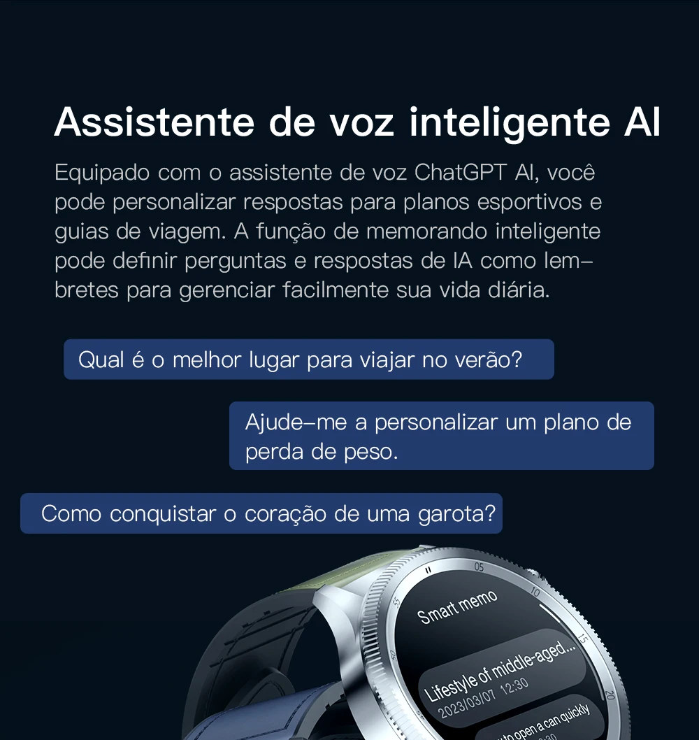 ? Assistente de Voz com Inteligência Artificial – Responda perguntas, crie lembretes com o Smart Memo e personalize mostradores via comando de voz.